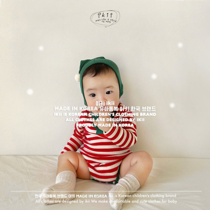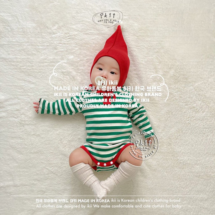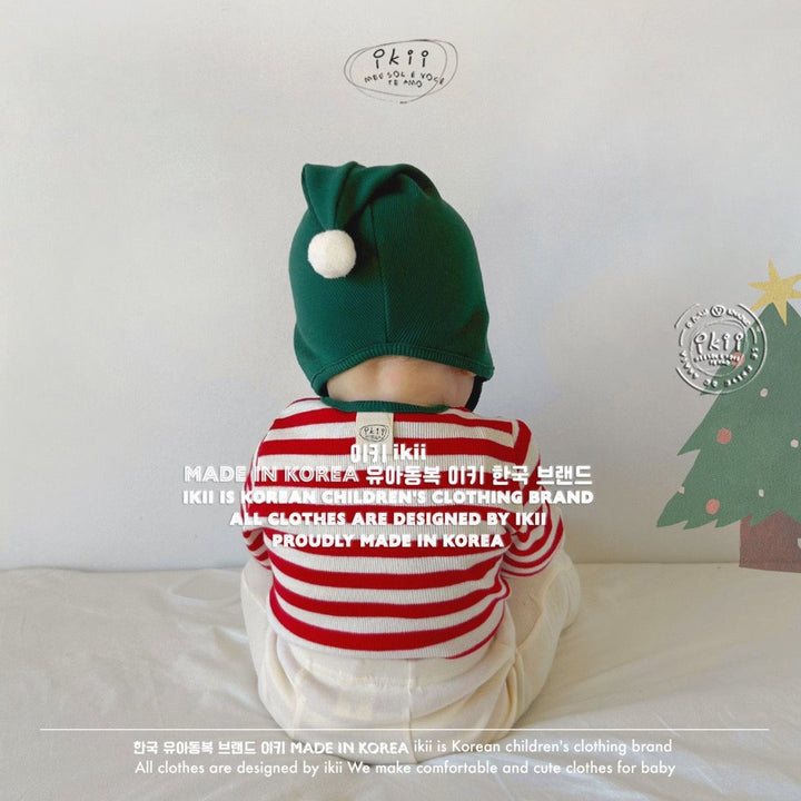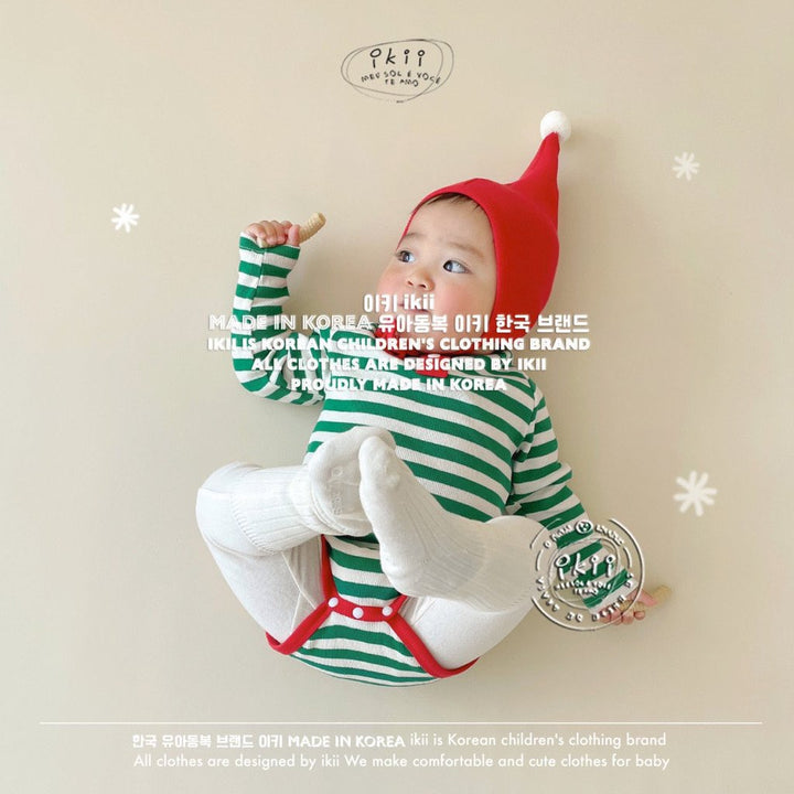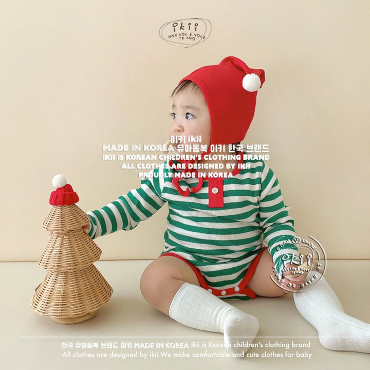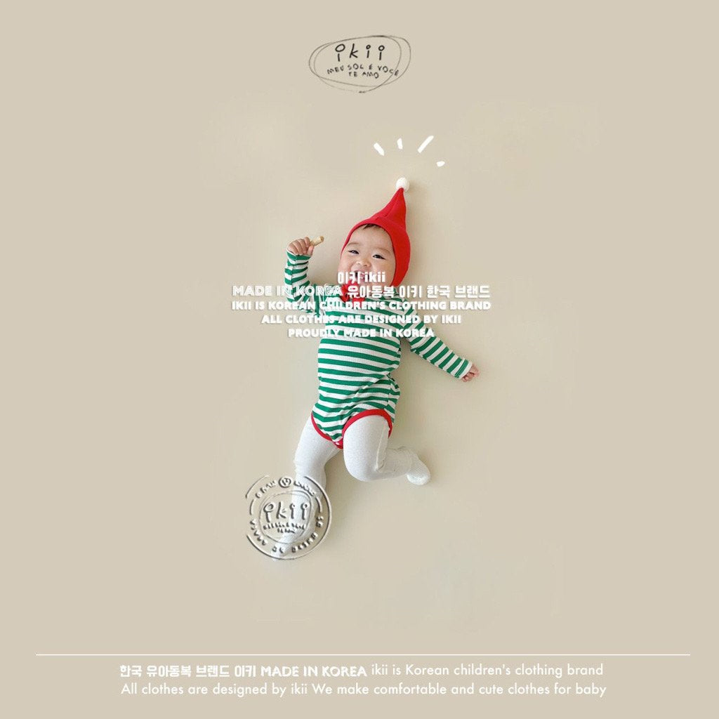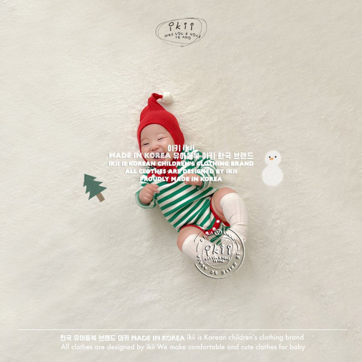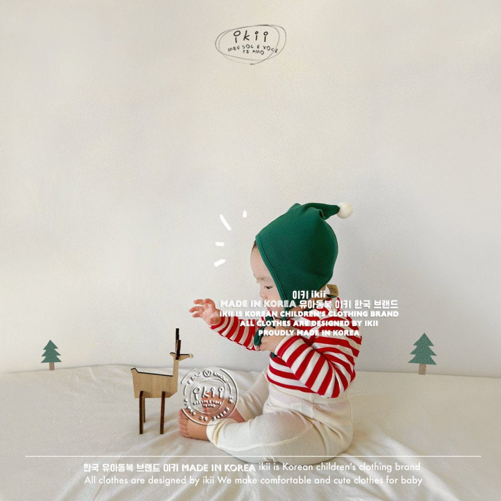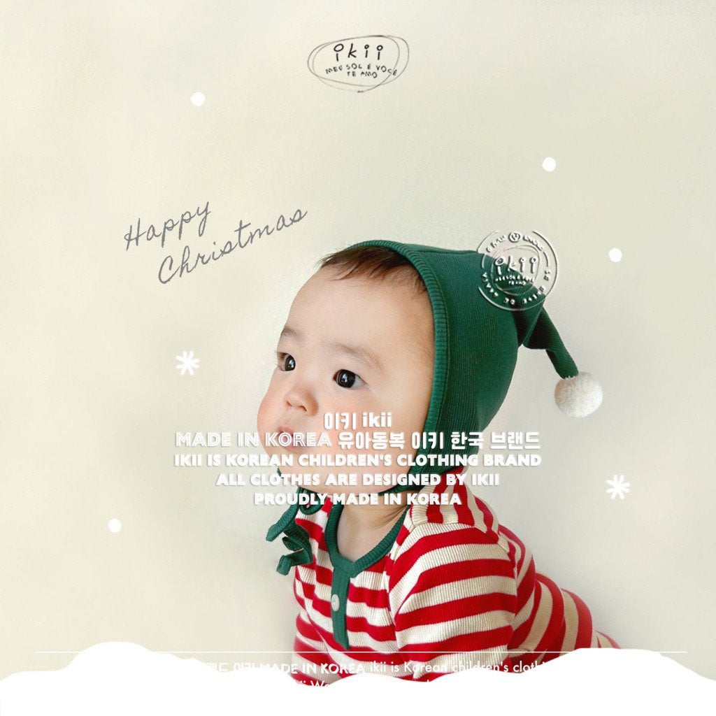 Add a cheerful touch to your baby’s first holiday season with the ikii Christmas Elf 2-piece set. This playful outfit includes a soft ribbed bonnet with a white pom pom tip and a matching striped bodysuit in festive green or red. Made in Korea from cotton, it feels gentle on delicate skin and stretches comfortably for everyday wear. The front snap buttons make changing easy, while the snug fit keeps baby warm and ready for cozy Christmas photos.