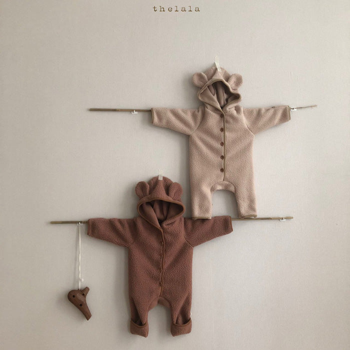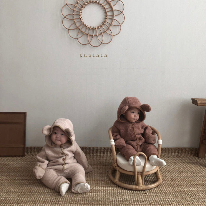 Keep your little one snug and adorable all winter with THE LALA Baby Bear Winter Jumpsuit! Featuring cute bear ears on the hood, this soft and warm jumpsuit is perfect for cold winter days. The front buttons make dressing and diaper changes quick and easy, while the plush fabric ensures maximum comfort and warmth. Whether you're heading outside for some winter fun or staying cozy indoors, this jumpsuit is both practical and cute. Made with love in Korea, it’s the perfect outfit to keep your little bear bundled up in style all season long.